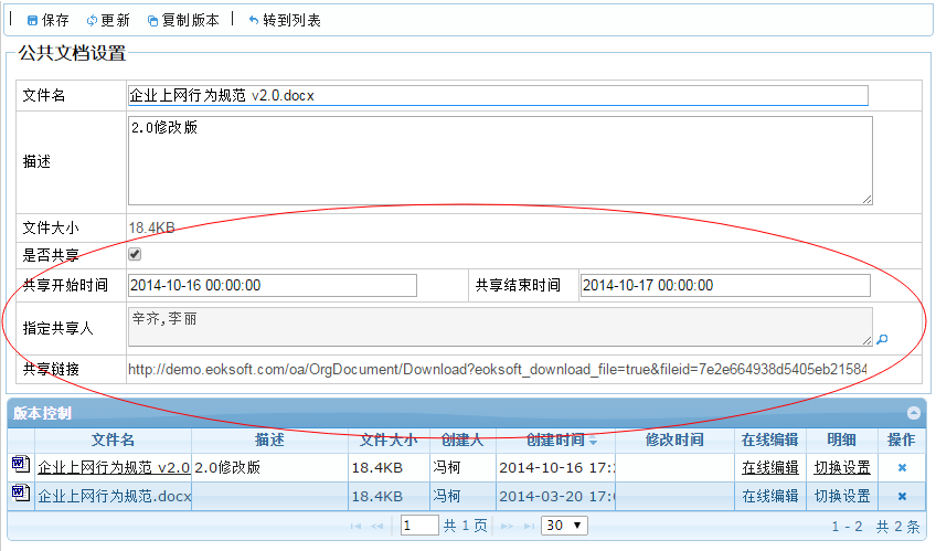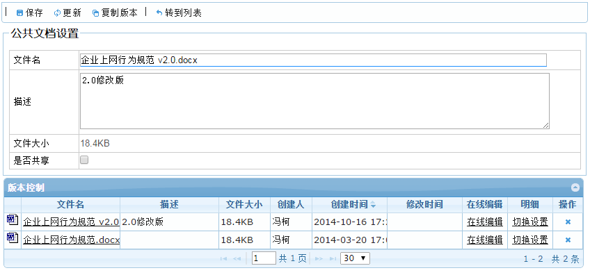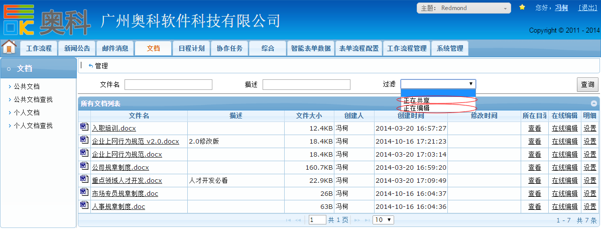 对有权限的用户,系统提供文件下载、在线阅读功能: ![]() ![]() 对有权限的用户,系统还提供文件在线编辑功能: ![]() ![]() 公共文档(知识库)高级功能所有文档都支持版本管理: ![]() 所有文档都支持共享(借阅)和取消共享(归还): ![]() 同时,通过“公共文档查找”,可筛选出“正在共享”(正在借阅)、“正在编辑”的文档: ![]() 个人文档个人文档跟公共文档类似,但针对的目标是登录用户本人。 ![]() 个人文档同样有文件下载、在线阅读、在线编辑、文件共享(借阅)、取消共享(归还)、文件版本管理、文件查询等功能服务。 |