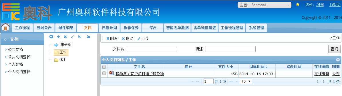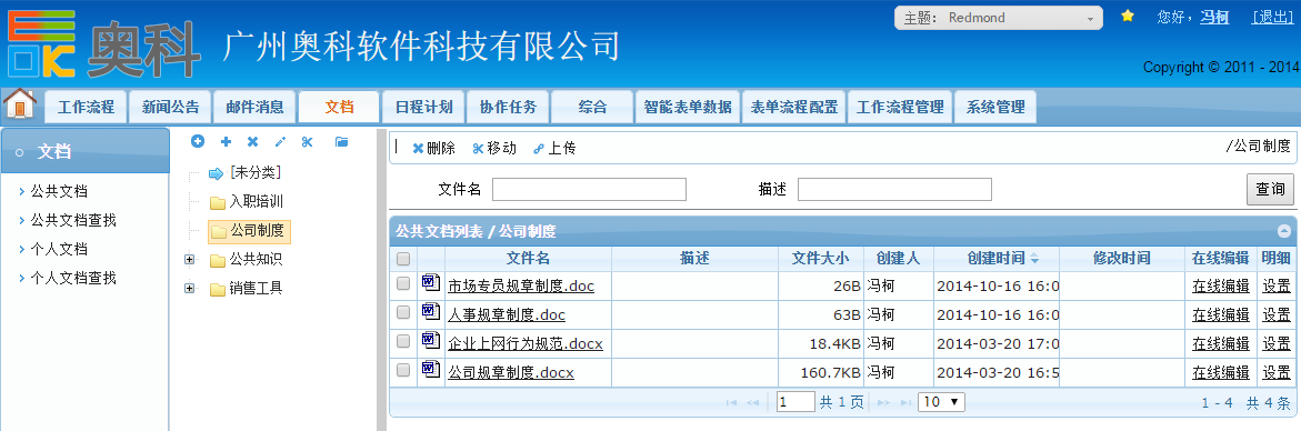 公共文档(知识库)常规功能奥科OA协同办公平台的公共文档,可作为企业的知识库,放置各种公共文档: ![]() 左边的目录树,允许管理员自定义且设定控制权限: