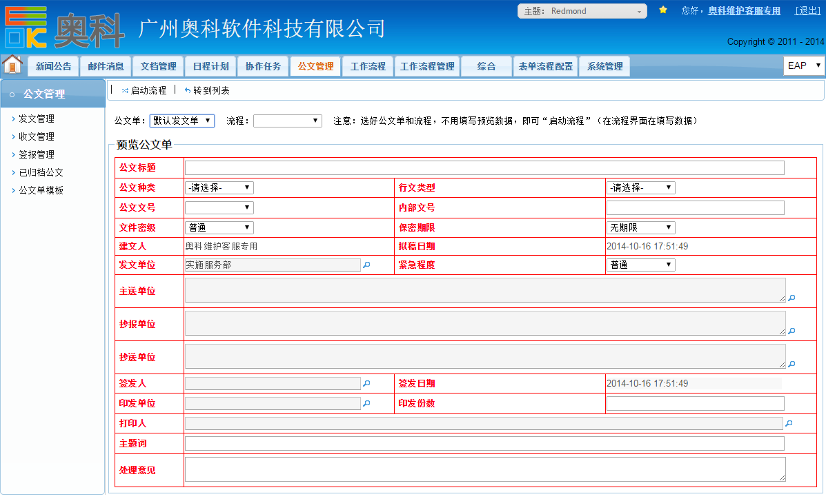 系统支持标准的“发文”、“收文”、“签报”等常见的公文,其他特殊公文,只要联系奥科,都可进行开发满足需求。