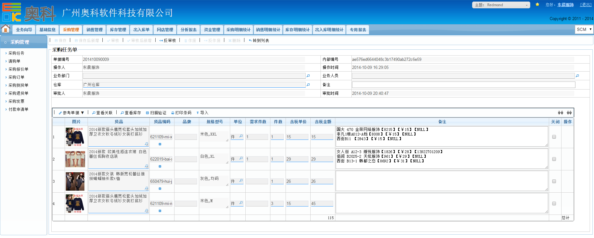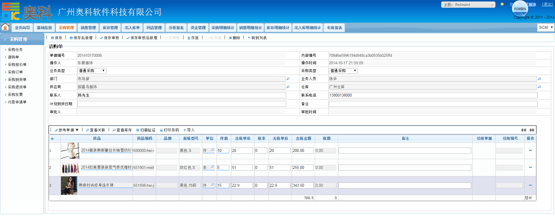 奥科供应链的采购管理主要包含了“采购任务”、“请购单”、“采购报价”、“采购订单”、“采购到货”、“采购入库”、“采购退货”、“采购发票”、“付款申请”等功能: