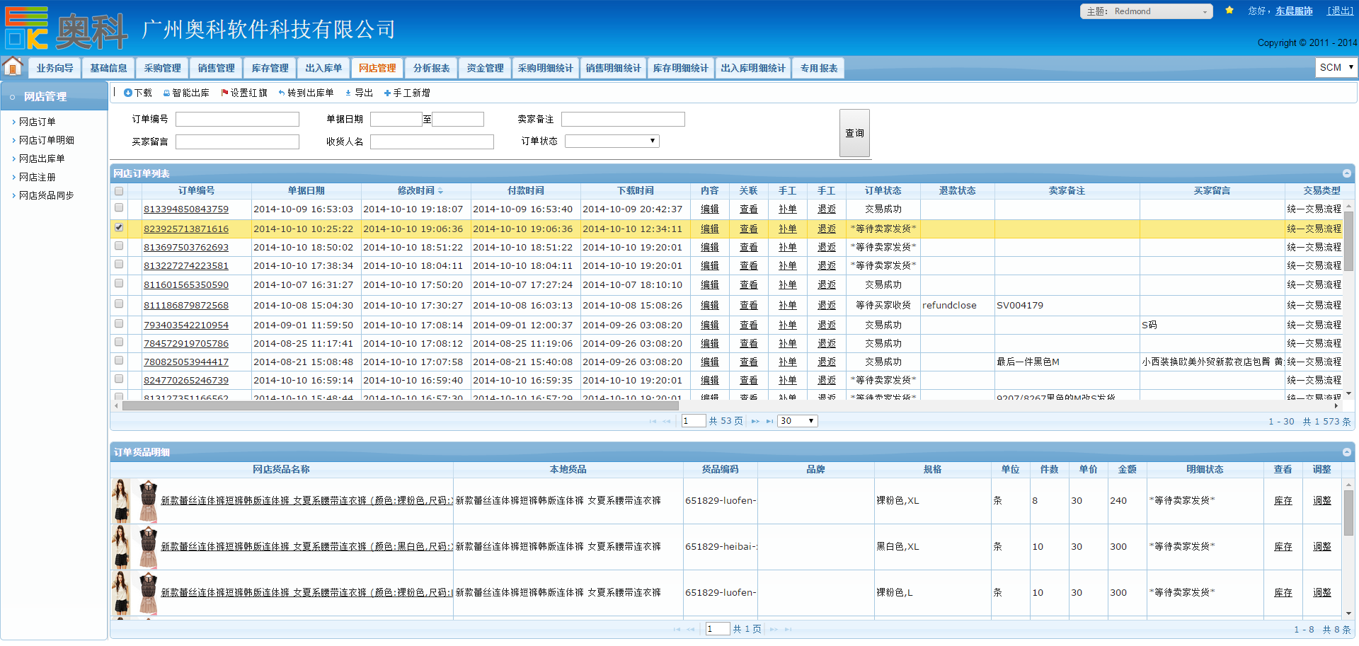 奥科供应链管理平台提供专门的网店管理模块用于管理来自于外部电商(比如淘宝、阿里巴巴、腾讯拍拍等)的订单。